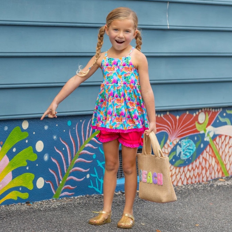 The brightest boldest summer colors, with water color drawn sea turtles and sea coral and other sea features. Adjustable straps, smocked back, for easy fit. Twirl skirt. Bloomers from 12m-4, and athletic shorts size 5-16.