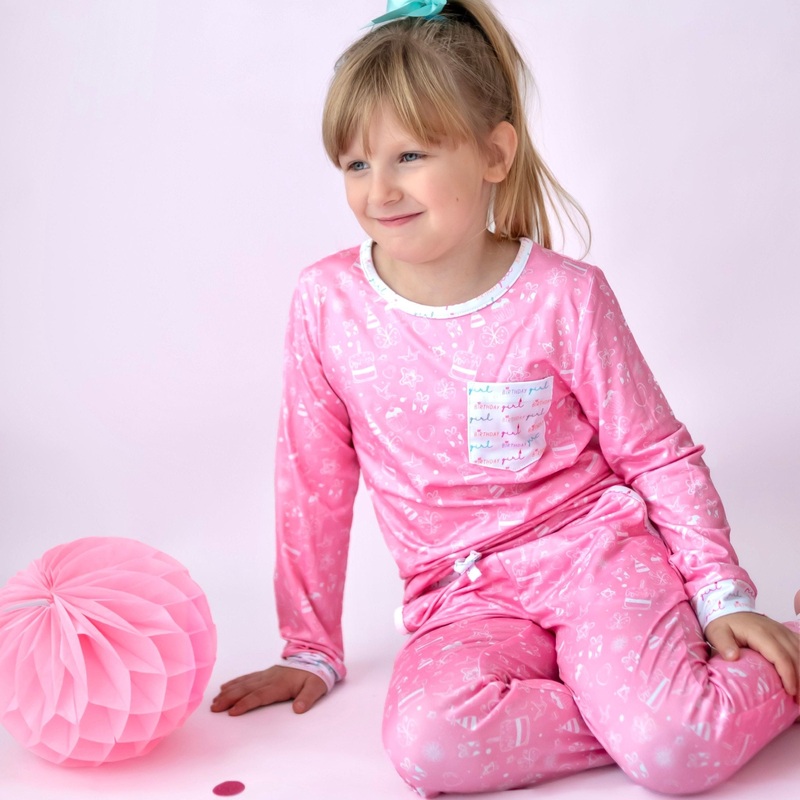 Our popular two piece lounge set, with long sleeve top and jogger pants. In our pink birthday print and accented with our Birthday girl print. In our cozy lounge fabric (poly/cotton/spandex blend). Working drawstring on the waistband, pockets!