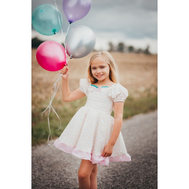 This one has it all! Twirly skirt, lined for extra shape, puff sleeves, smocked back for easy fit, organza pink ruffle on skirt of the dress, sweetheart neckline with ruffled detail and a bow.