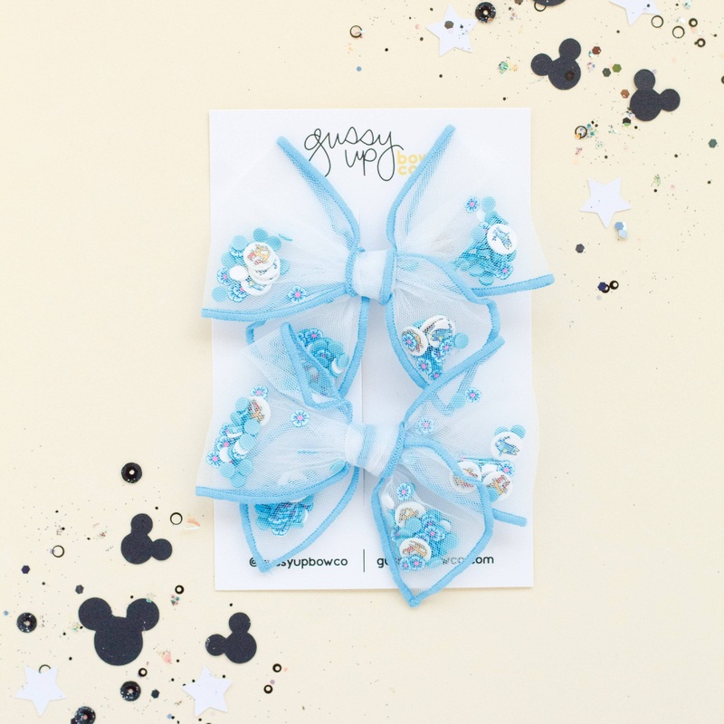 What youll get: * A set of 2 hand tied bows perfect for pigtails- approximately 3 1/2 x 3 inches on a reversible alligator clip with teeth AND our exclusive stay-all-day non-slip grip Our bold, fanciful, and totally original Whimsy Bows are the perfect acc