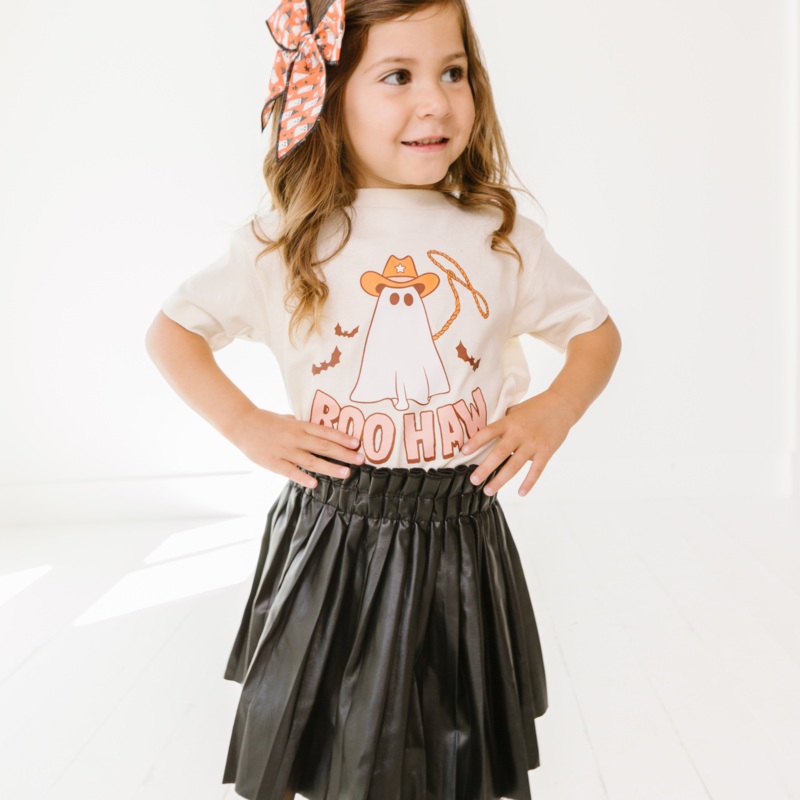 Boo Haw Halloween!Features & Sizing*Crewneck, pullover styling*Short sleeves*Natural, Pink or Peach Colored Shirt*Print as shown in picturesMaterials & Care*Soft Feel *100% Cotton *50% polyester, 25% combed & ringspun cotton, and 25% rayon *Machine wash co