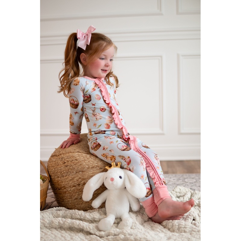 Florals and Eggs and Bunnies oh my! Hop into Easter with this adorable Easter zippee! Perfect for celebrating the season, The light blue zippee features a classic yet unique design of bunnies, florals, Easter baskets, decorated eggs, and butterflies with accents in shades of pink. A ruffle trim down the zipper adds a touch of sweet charm.