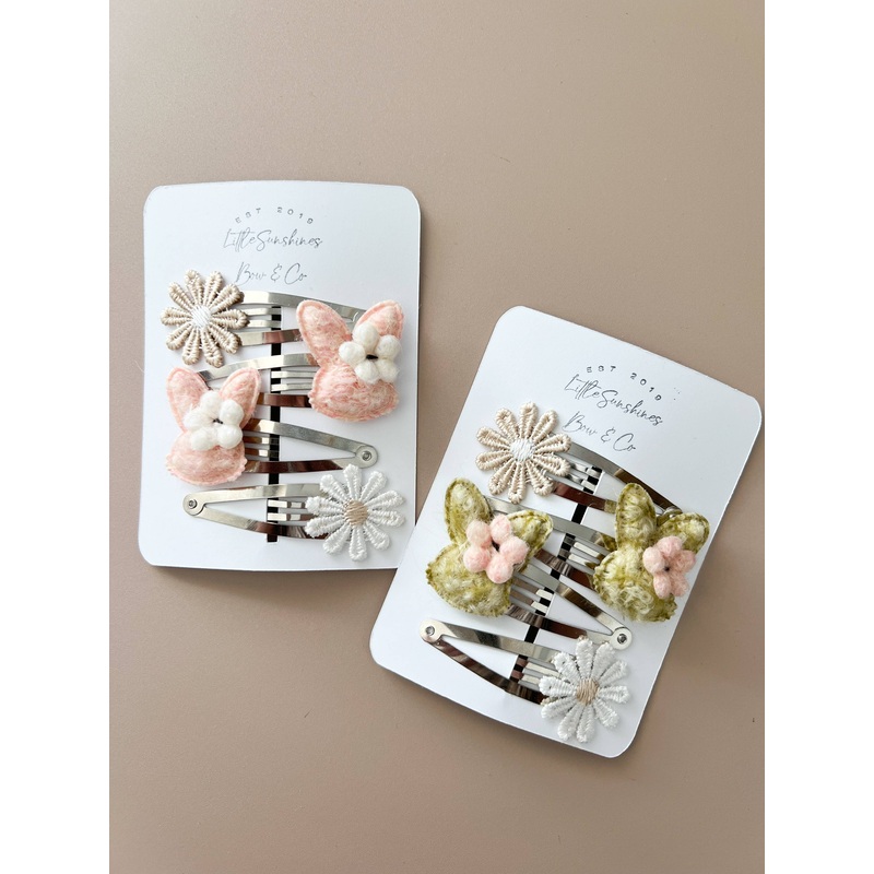 These cute clips are the perfect addition to your hair accessory section!These bunny & flower embellishments are attached to a silver snap clip1 Set includes 4 clips:2 Matching Bunny Snap Clips1 White Flower1 Beige FlowerFlower hair clips are perfect for a