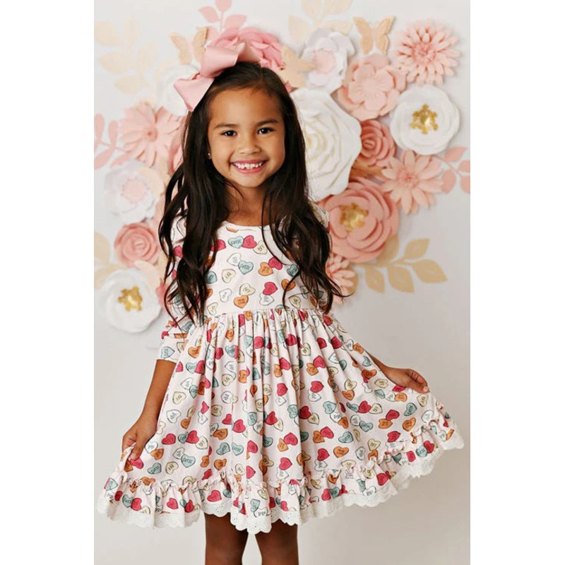 Indulge in the sweetness of style with Swoon Baby Girls Candy Hearts Eyelet Dress. This adorable dress features an all over candy heart print, paired with an eyelet trim, making every twirl a moment of joy. Shop now for the perfect valentines dress!