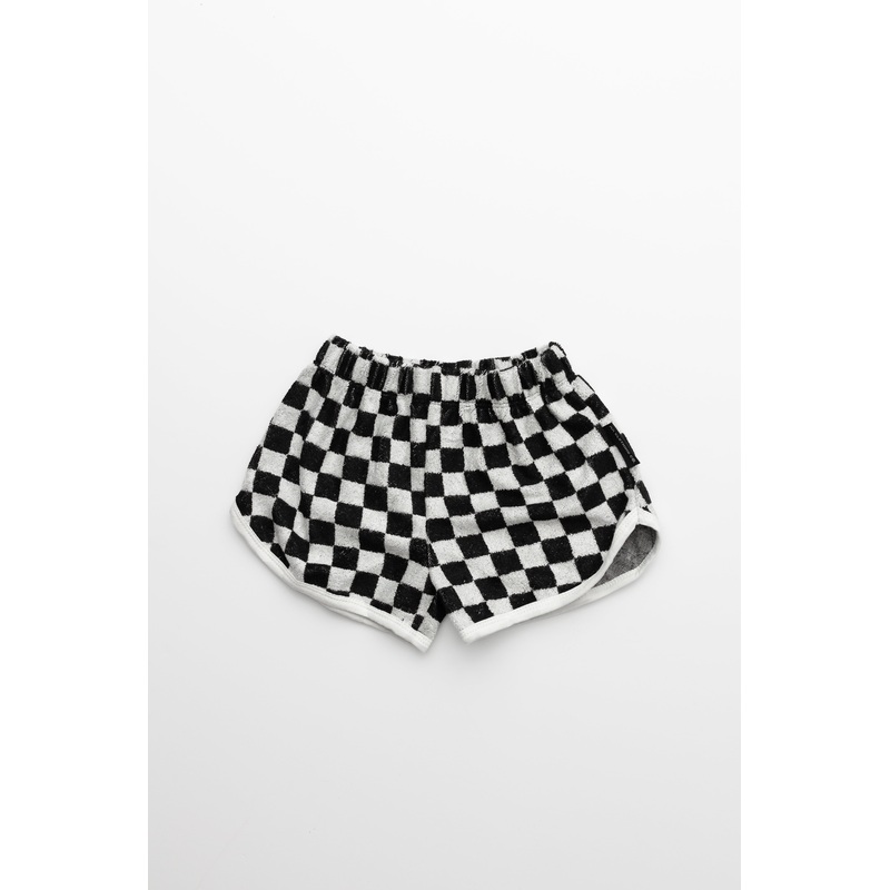 retro inspired, terry cloth checker shorts are perfect for post pool or play! Running TTS, fitting more like a 70s track short