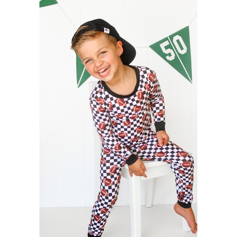 Be ready for some extra fun in the sun with this Checkered Football Dream Set! This adorably stylish two-piece is perfect for boys and girls alike, so you can enjoy the game-winning look of this pajama top and bottom. Score big with your fashion sense!