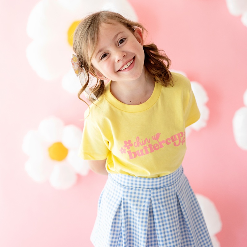 Chin up ButtercupFeatures & Sizing*Crewneck, pullover styling*Short sleeves*Coral or Teal PrintMaterials & Care*Soft Feel *100% Cotton - Natural, White and Black, Pink*50% polyester, 25% combed & ringspun cotton, and 25% rayon - Ice Blue & Peach*Machine wa