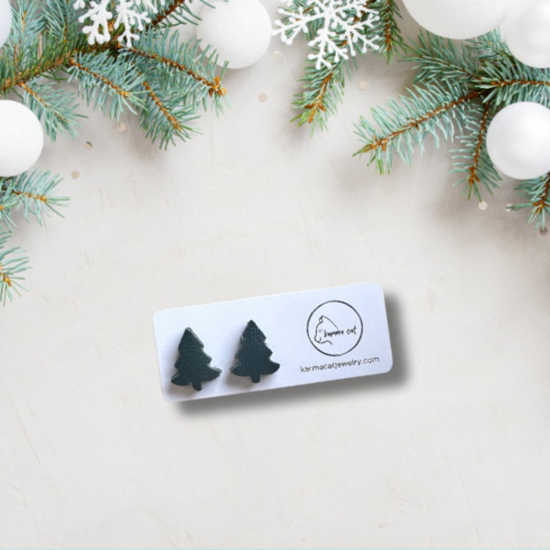 These hunter green Christmas tree studs will add some whimsical spirit into the holidays! They are handmade from upcycled leather. Perfect for all holiday parties and also everyday wear. They are also very lightweight - each earring weighs less than .25 oz
