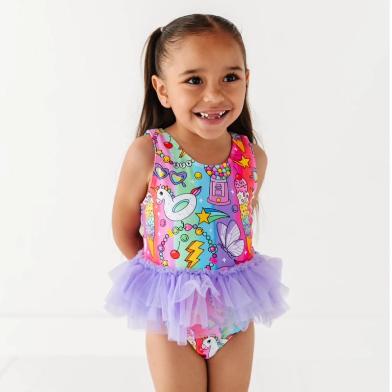 We just added **brand new** swimwear to our line! Great for the summer months and sibling matching! Our suits are great for splashing. playing, and riding waves! What makes our swimsuits special? Every little detail, designed by 4 moms. * Exterior: 80% Nylon, 20% Spandex * UPF 40+ to protect against those rays * Trendy tutu * Quick-drying fabric * Scoop neckline * One-of-a-kind art