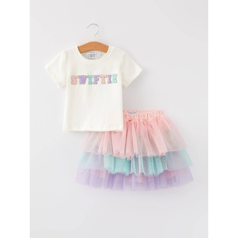Get ready to rock the world with this "SWIFTIE" T-shirt and gauze skirt set! Made with soft cotton and featuring a bold applique, this outfit will keep your little girl comfortable and stylish while showing off her love for Taylor Swift. Perfect for concer
