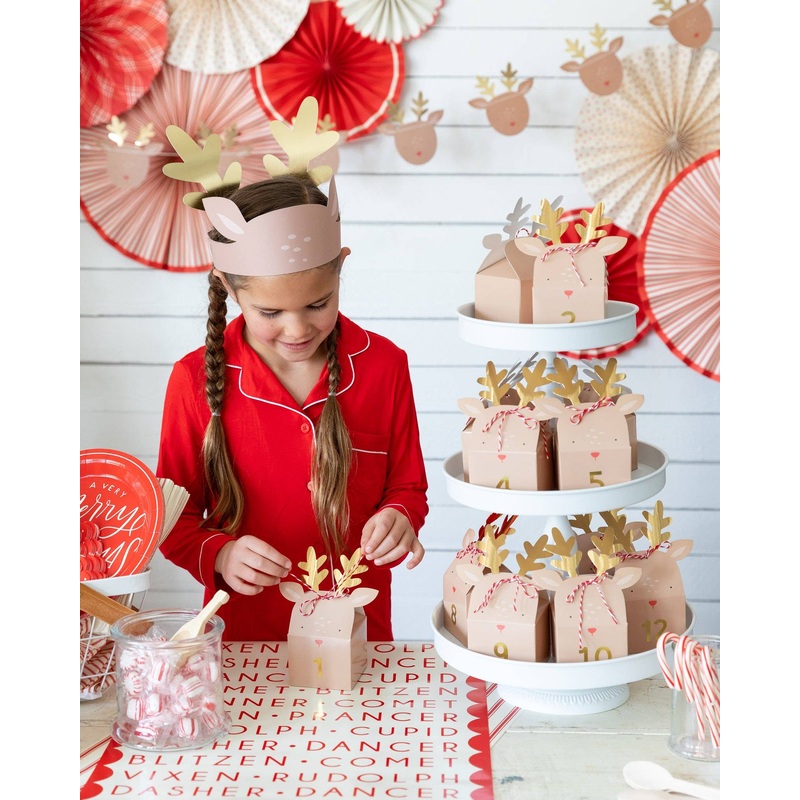 Count down the days the days to Santa's arrival with his reindeer! Included in this advent kit is 12 kraft boxes with die cut accents to look like Santa's reindeer, and are the perfect way to celebrate the 12 days of Christmas with festive goodies or small
