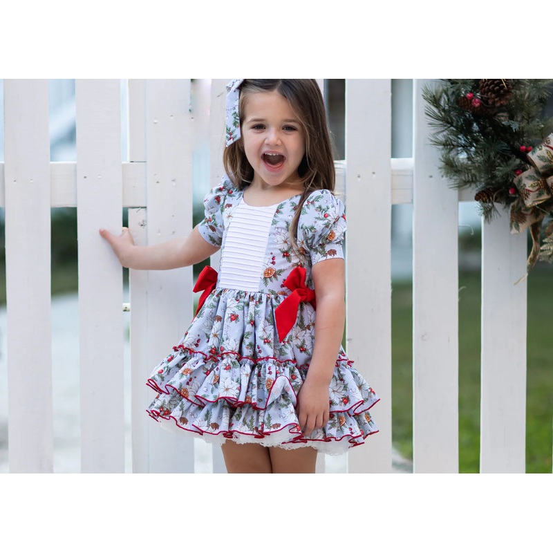 - Woven dress- Pleated bodice- Short sleeves- Red Bow accents on waistline- Double layered dress with attached petti skirt for fullness