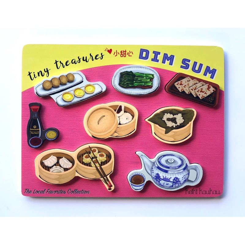 A wooden chunky puzzle representing Chinese Dim Sum dishes from siu mai to egg tarts. Ages 1.5+.