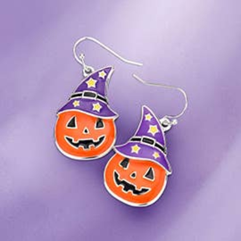 Size : 0.75" X 1.4" Fish Hook Back Celebrate spooky season with these playful pumpkin earrings featuring witch hats and starry details. A whimsical Halloween accessory perfect for costumes, themed events, or adding seasonal flair to any outfit. Lead and Ni