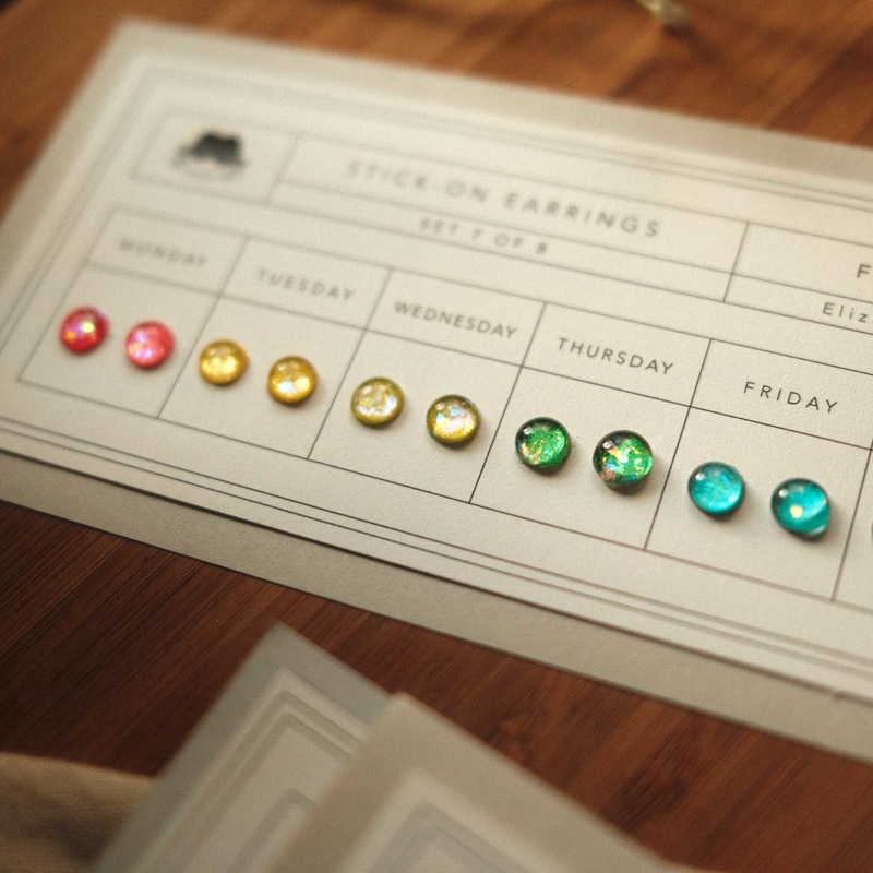 A flash back to the past, this Fairy Dust Stick-On Earring set features a new color for each day of the week! Earrings are metallic-holographic and shimmer in the light. Just peel and stick! Each stay on up to 24 hours. Since each item is handmade, please