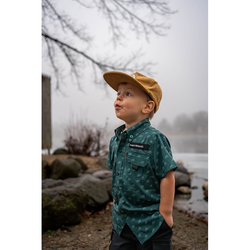 This fishing shirt for littles is perfect for outdoor adventures. The beautiful green color and mountain print add a touch of style, while the velcroand zip pockets provide convenient storage. With breathable and sun-protective features, this shirt is a must-have for any outdoor enthusiast.