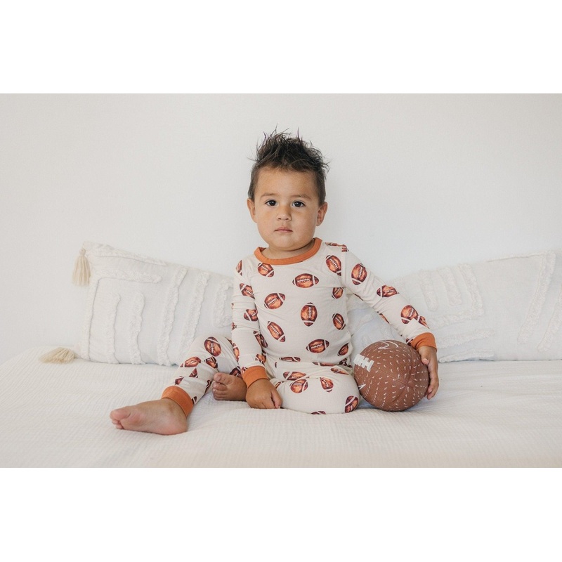 Elevate your little one's bedtime with our Football Print 2pc Bamboo Pajama Set. This set includes a cozy long sleeve shirt and comfortable pants, designed for a peaceful night's sleep.Crafted from a premium blend of 95% bamboo viscose and 5% spandex, thes