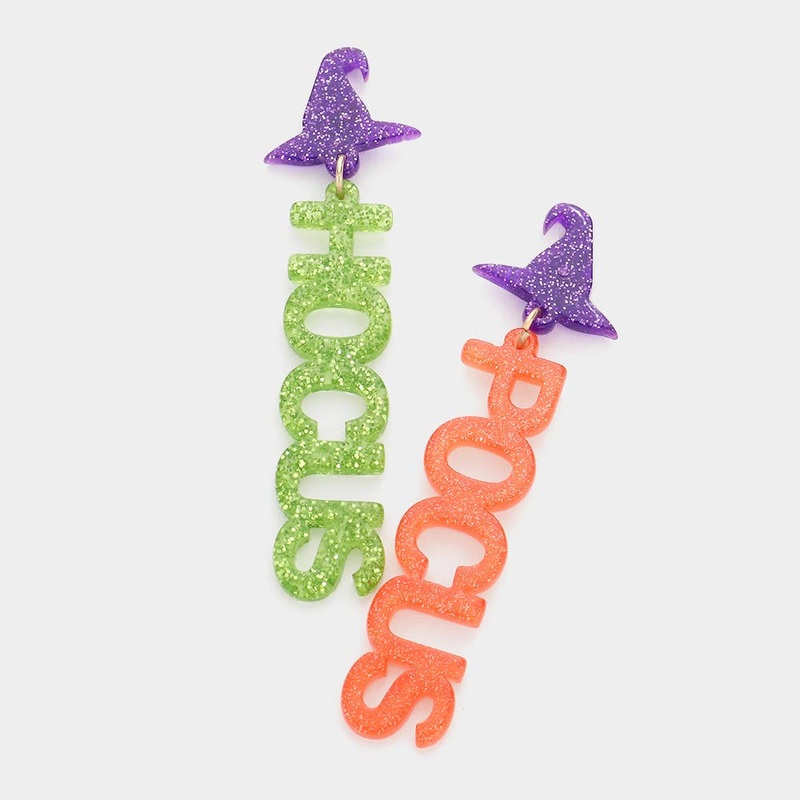 Size : 0.75″ X 2.75″Post BackLead and Nickel CompliantCast a stylish spell this spooky season with these mismatched HOCUS and POCUS earrings! Designed with glittery lettering and topped with playful purple witch hats, these lightweight dangles bring bold Halloween vibes to any outfit or boutique display.