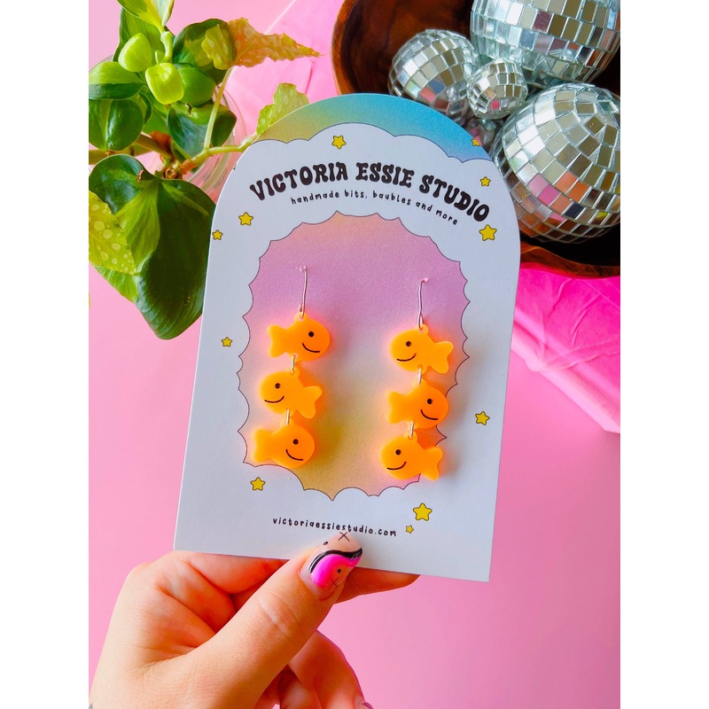 Liven up any outfit with these silly goldfish earrings! Perfect for fans of tasty snacks, these earrings are an eye-catching, unique accessory. Crafted with cracker-inspired details, they’re sure to make a splash in any wardrobe!Product DetailsDrop length ~2Lightweight with surgical steel post/hook. Finding will depend on availability (Nickel free) Each pair is hand made with care. No two pieces are the same and will vary slightly from picture. ShippingTo reduce waste, most items are made to order. Please allow 15-20 business days for your order to be fulfilled.
