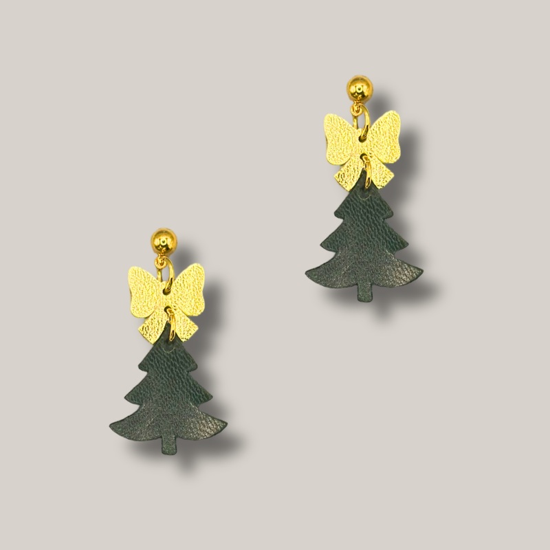These hunter green tree and gold bow earrings are perfect to add some whimsical spirit into the holidays! They are handmade from upcycled leather. Perfect for all holiday parties and also everyday wear. Lead and nickel free. They are also very lightweight