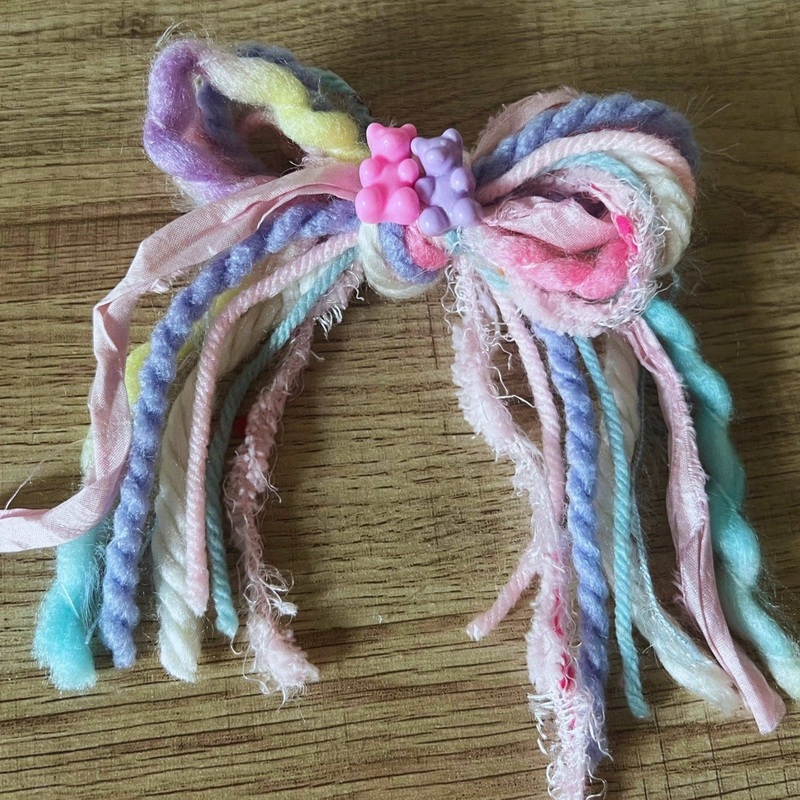 This pastel hair bow is topped with the sweetest pair of Gummy Bear friends. Each bow is uniquely handmade out of pastel yarn and tinsel in a palette of Spring + Easter colors, then topped with two gummy bear beads. Gummy bears will be a mix of pastel colors – pink, purple, blue, mint green, or yellow. Bows measure around 3.5″ wide x 4″ long, and are attached to a small gold alligator hair clip measuring 1.8″ wide. Due to the handmade nature, there will be variations in yarn color and size. The bow you receive will be close to, but not exactly as pictured. PLEASE READ: Do not let children put these in their mouths, the beads could break off and become a hazard. Oversight is extremely important If pulled hard enough, these will break. Wear them gently