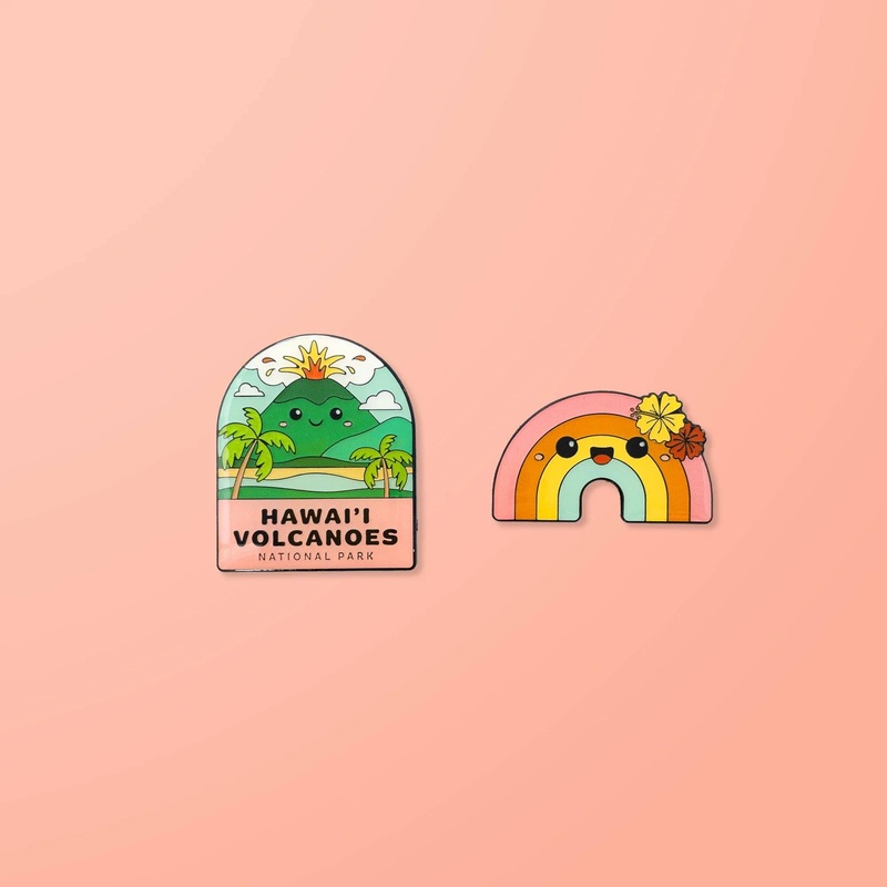 Embrace the fiery spirit and vibrant colors of the islands with our Hawaii Volcanoes Enamel Pin Set from Pin Pin Pals! This delightful set features two high-quality enamel pins: one of a cute rainbow and the other showcasing a Hawaii Volcanoes Park badge.