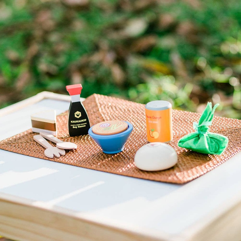 A wooden play food set of More favorite Hawaii treats! Poi, saimin, passion orange juice, manapua, haupia pie, soy sauce, and the cutest little laulau made of felt. Ages 3+.