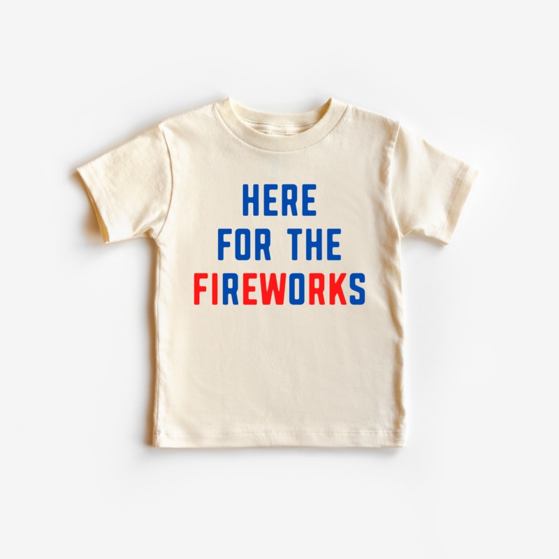 Here for the Fire Works|2T|3T|4T|5T|Youth Small|Youth Med|Youth Large|Natural|Pink|White|Ice Blue|Peach|Grey
