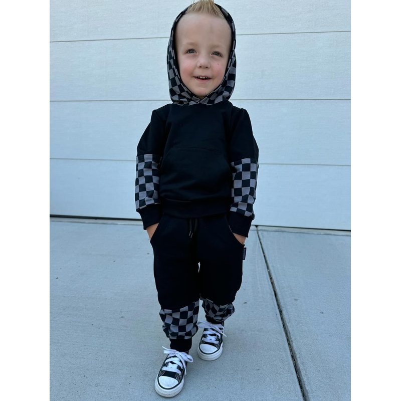 Stand out in the one-of-a-kind Hux Sweatset! Featuring bold checkered patterns on parts of the legs and sleeves, this design is paired with sleek black for the ultimate blend of edgy and classic. Crafted for year-round wear, its as versatile as it is stylish. Complete with front pockets and a cozy hood, this sweatset is perfect for lounging, layering, or making a statement wherever you go. Get yours nowbecause you wont find this design anywhere else!
