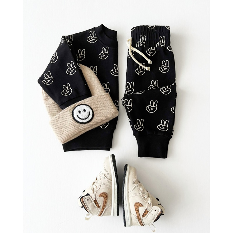 Good Vibes all around! This two-piece set is made of oh-so-soft cotton, perfect for daily lounging during the upcoming Spring months! Stylish enough for a day out, cozy and comfortable for play. Gender neutral and up to 9Y, this sweet and simple design wil