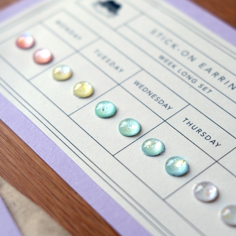 A flash back to the past, this Kawaii Magic Stick-On Earring set features a new color for each day of the week! Earrings are metallic-holographic and shimmer in the light. Just peel and stick! Each stay on up to 24 hours. Since each item is handmade, please allow slight differences between orders. Items are all handmade in the USA by Made by Wheeler.