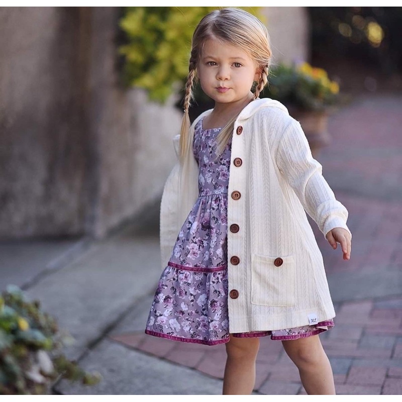 -Super soft light weight sweater fabric, with a cable knit design.-48% rayon, 19% nylon, 29% polyester, 4% spandex-3 colorways: Ivory, Carmel/tan, and Pink-Fit is true to size-Wood buttons-Hood-Perfect weight for winter and all spring and fall too!Size 2-1