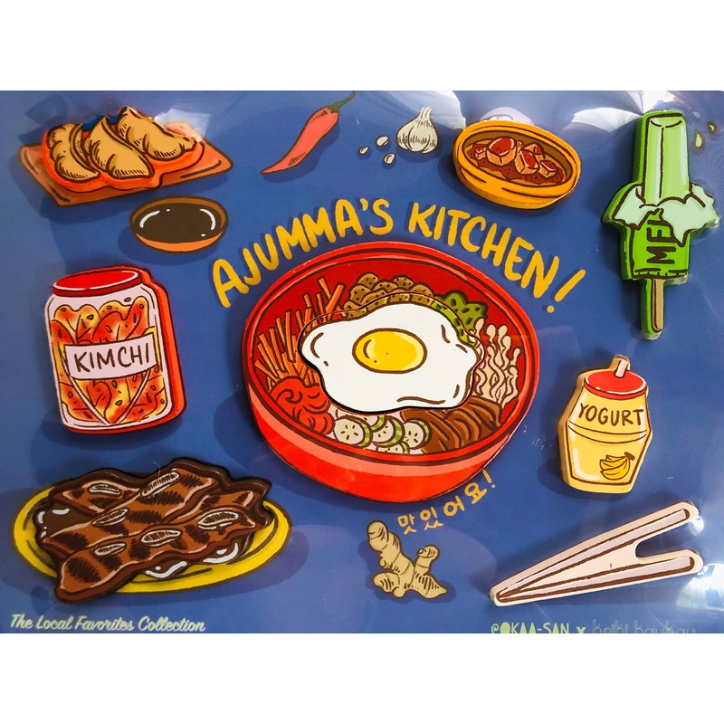 In Ajumma's (Auntie's) Kitchen, you'll find some of the most popular Korean dishes and kid-friendly snacks:Bibimbap - rice topped with sauted and fermented vegetables and a fried eggKalbi - barbecued short ribsKimchi - spicy, fermented cabbageMandoo - dump