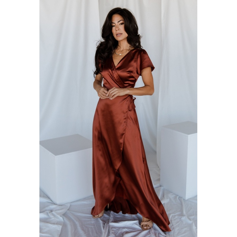 exclusivestyleFeel glamorous in an instant with this stunning gownStunningcinnamon colorSatin material with slight stretch and lots of shineTrue wrap stylewith V-necklineShort flutter sleevesWrap ties at waist loop through a hole in the side to tieMaxi len