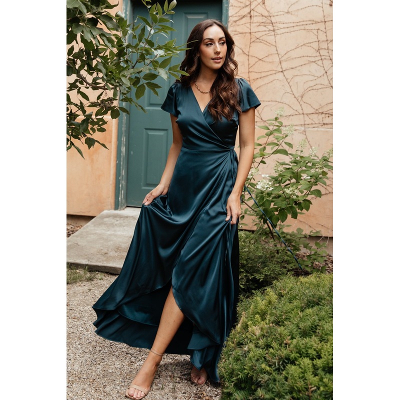 exclusive styleFeel glamorous in an instant with this stunning gownRadiant deep blue colorSatin material with slight stretch and lots of shineTrue wrap stylewith V-necklineShort flutter sleevesWrap ties at waist loop through a hole in the side to tieMaxi l