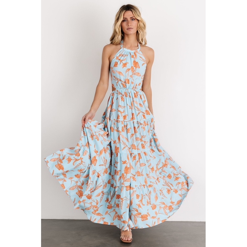 exclusivestyleGet ready for this perfect light weight maxi dress!Light blue with orange floral printPull-on styleHigh necklineAdjustable neck and back tieOpen backTiered maxi skirtNot lined - slightly sheerSelf: 100% PolyesterSkye is 5'9, cup size 32A, siz