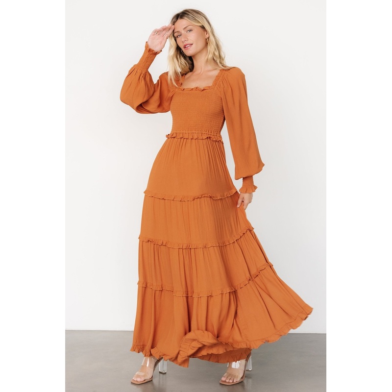 Stay comfortable while looking classySolid camel colorMaterial has no stretchSquare neckline with ruffle detailSmocked bodiceLong sleeves with smocking and ruffle detail at cuffsTiered maxi skirt with ruffle detailsSkirt lined until second to last tierSelf