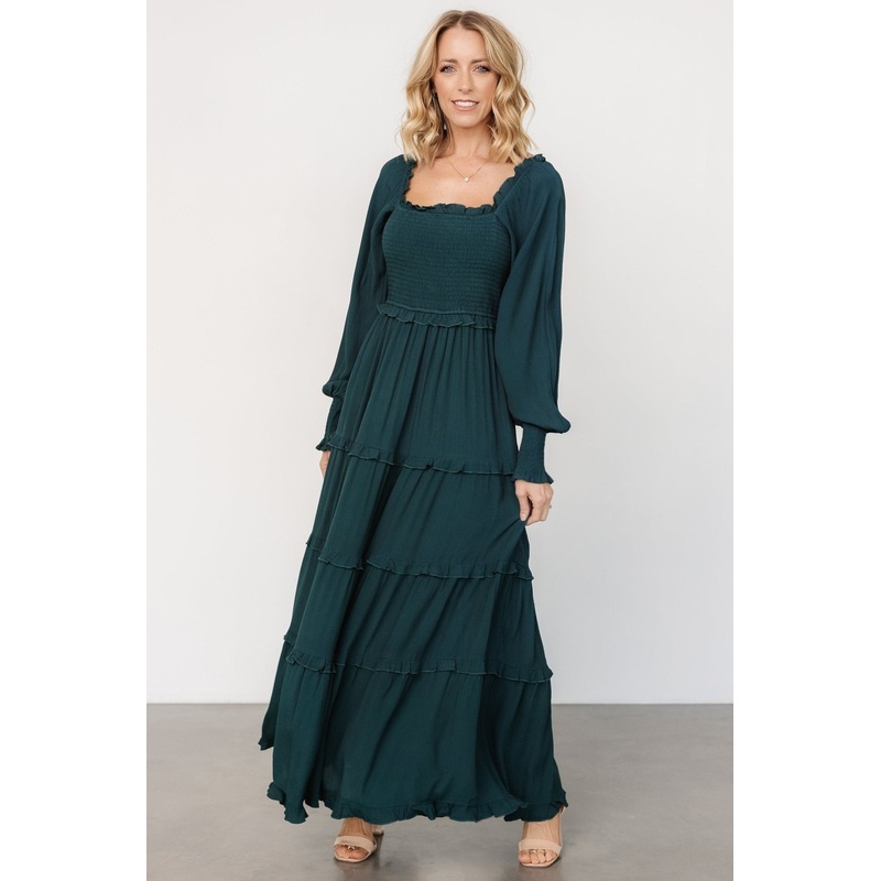 Stay comfortable while looking classyDeep green colorMaterial has no stretchSquare neckline with ruffle detailSmocked bodiceLong sleeves with smocking and ruffle detail at cuffsTiered maxi skirt with ruffle detailsSkirt lined until second to last tierSelf: