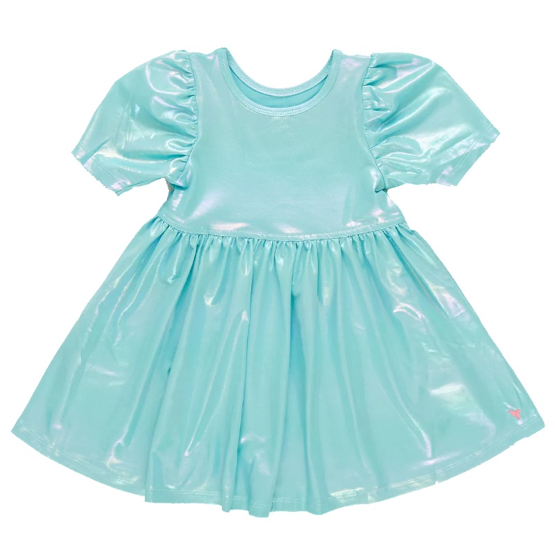 Glam Squad! The spotlight will shine on your little starlet when she takes a turn in our collection classic Girls Lame Laurie Dress! Fashioned in a shimmery turquoise lam, this Pink Chicken staple features a scoop neck, gathered short puff sleeve and a twirl ready full skirt!