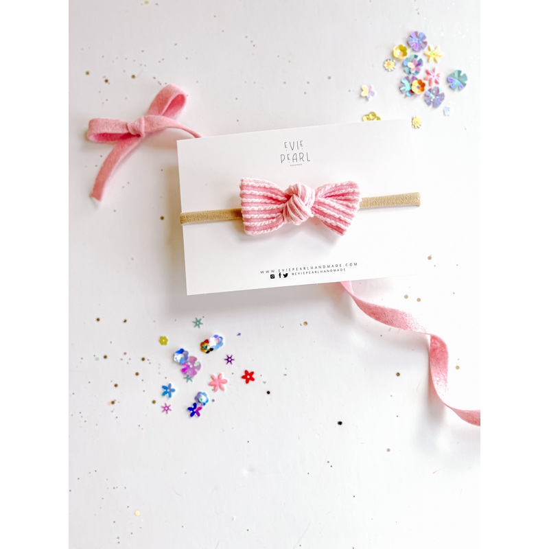 Our **Small Ribbed Knot Bow on Nylon Headband for Babies** offers the perfect mix of style and comfort. This **handmade bow** is soft, stretchy, and ideal for newborns and babies, making it perfect for everyday wear.