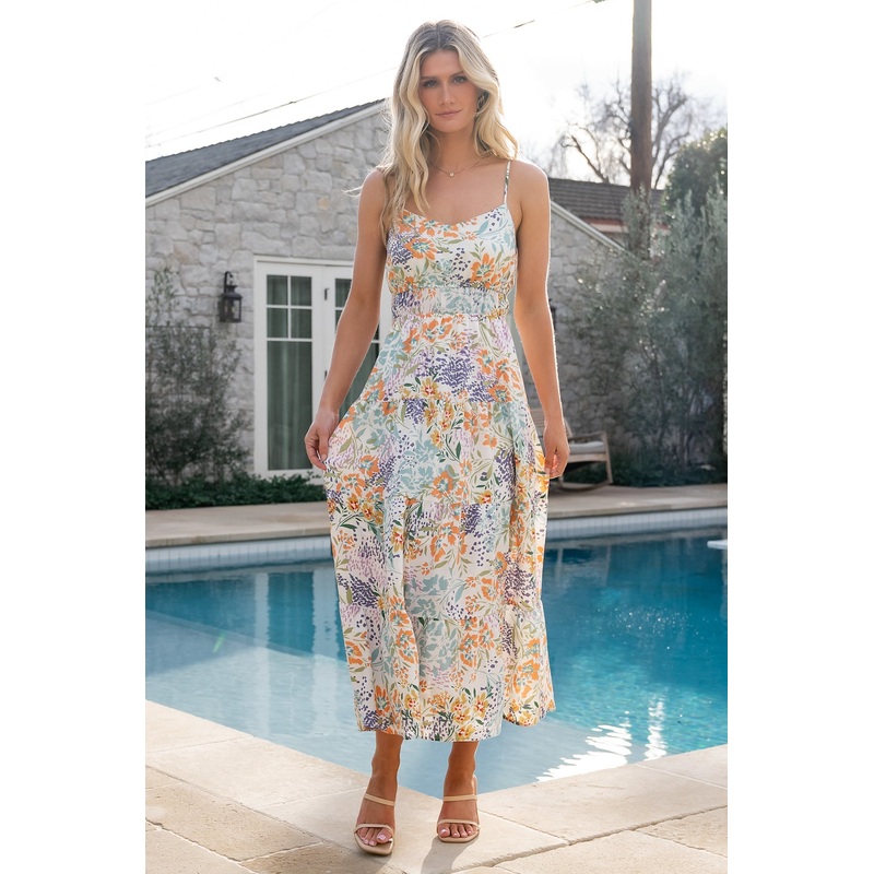 exclusivestylePerfect warm weather dressSubtle patterned weave Polyester blend fabricSoft Off-White background with muted colorful floralsWide V-necklineAdjustable strapsBloused bodice with elastic at waist panelGathered waist panel at high waistAnkle-leng
