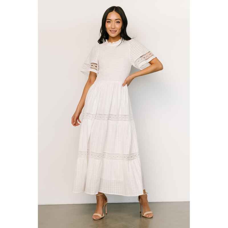 BalticBornexclusivestylePerfect off-white colorTextured design with lace detailing throughoutRuffled round necklineKeyhole and button at backOversized short sleevesSmocked bodiceElastic waist has stretchSide pocketsTiered, lined maxi skirtPlease note that