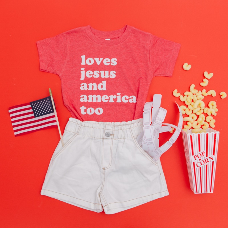 American Sweet Heart Tee! DetailsFeatures & Sizing*Crewneck, pullover styling*Short sleeves*Red, Blue or White PrintMaterials & Care*Soft Feel *100% Cotton * Heather Colors: 52% Airlume combed and ring-spun cotton, 48% poly* Athletic Heather: 90% Airlume c