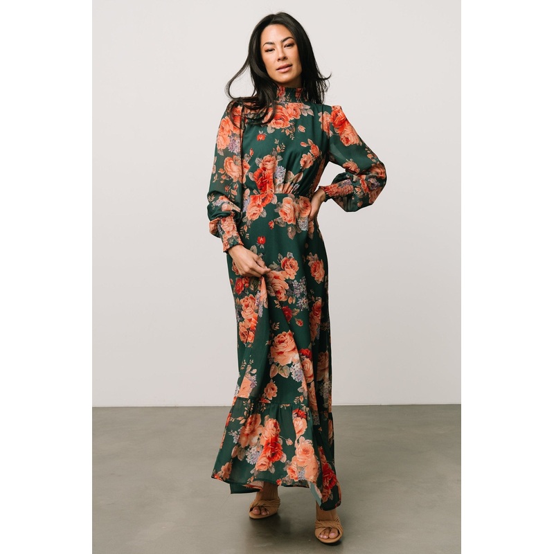 exclusivestyle!This dress offers more coverage for our girls that don't want to show too much. Perfect for wedding guests, bridal showers, and more!Cutegreen with orange multifloralFlowing chiffon materialHigh smocked neckline We recommend sizingupif in-be