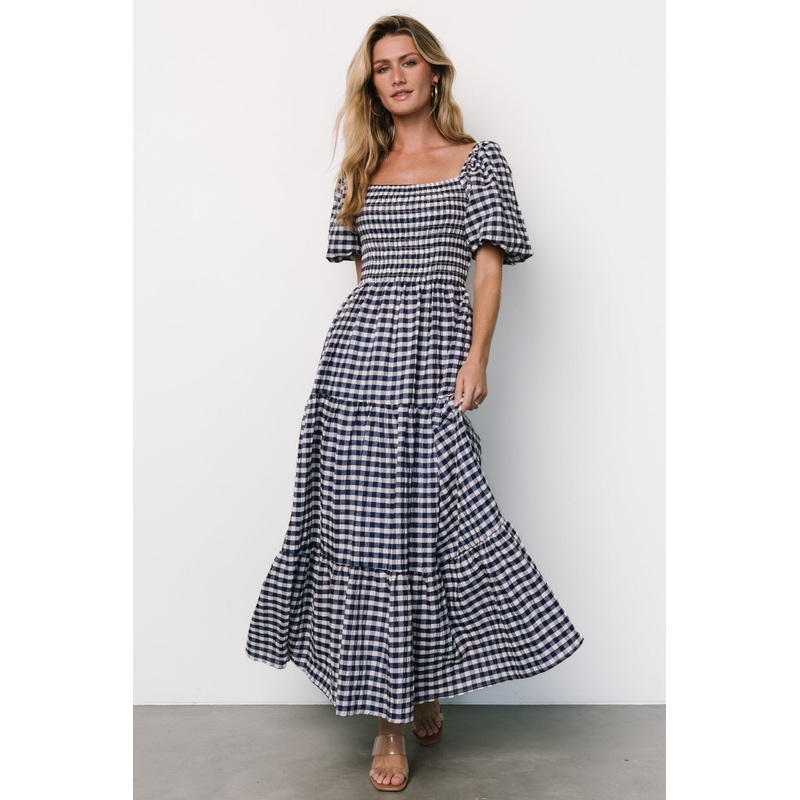 exclusive stylePerfect dress for any occasionTextured crepe material with some stretchDarling Gingham patternSquare necklineBalloon style sleeve with elastic at shoulderFully smocked bodiceMaxi length dress with three tiersFully linedSkye is 5'9, cup size