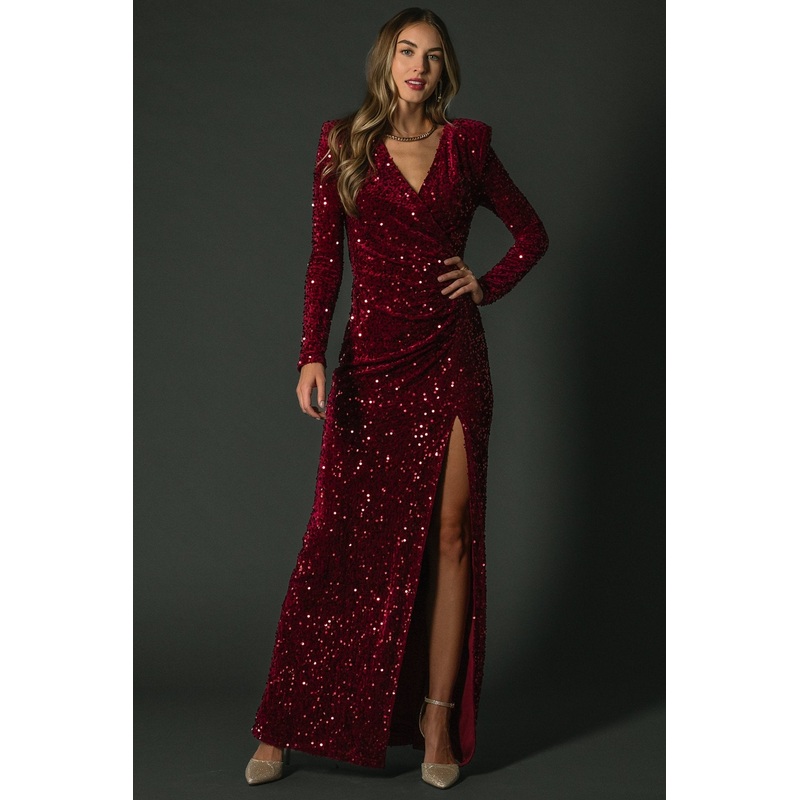 exclusive styleGorgeous Burgundy shimmer lookSoft velvet fabric with shimmer sequins and moderate stretchSurplice deep V necklineLong sleeves with padding at shouldersHidden zipper at backRuched detail from left waist to slit on skirtSlit from bottom hem t