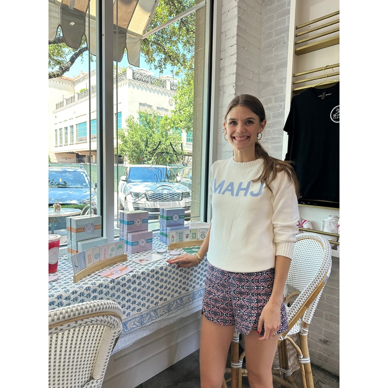 Knit MAHJ sweater- mid weight makes it a great piece year round! Available in white and baby blue or green and blush pink.