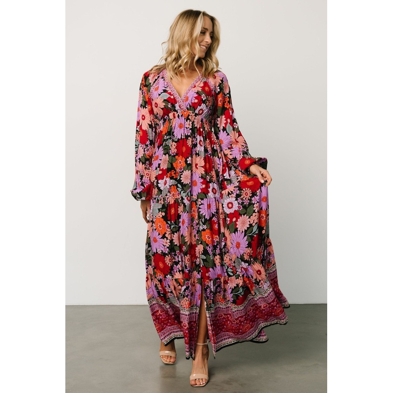 exclusive styleGorgeous black multi colorRayon material with no stretchCrossover V-necklineLong sleeves with elastic cuffsElastic waistband has stretchTiered maxi skirtLeft leg slitPartially linedSelf: 100% RayonLining: 100% Polyester Trina is 5'6, cup siz