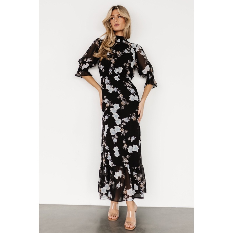exclusive styleSolid black color with slate blue floralsFlowing chiffon materialHigh smocked necklineKeyhole and double button at back neckShort sleeves with smocked ruffle cuffsPleated detailing at front waistElastic back waistSingle tiered maxi skirtFull