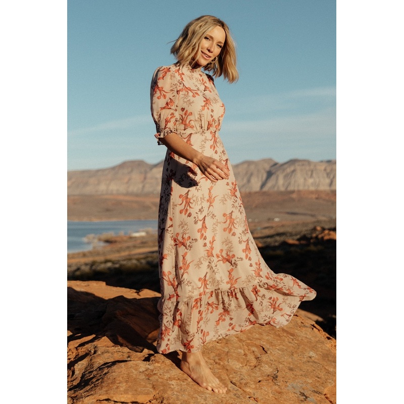 exclusive styleDusty blushfloralFlowing chiffon materialHigh smocked necklineKeyhole and double button at back neckShort sleeves with smocked ruffle cuffsPleated detailing at front waistElastic back waistSingle tiered maxi skirtFully lined excluding sleeve